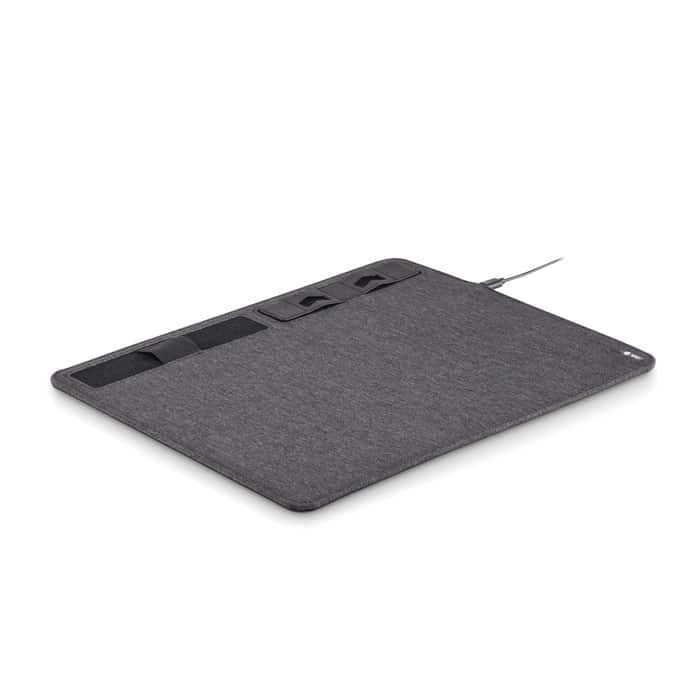 Večnamenska dvobarvna 300D poliestrska podloga za miško RPET z 10 W brezžičnim polnilnikom in funkcijo stojala za telefon.