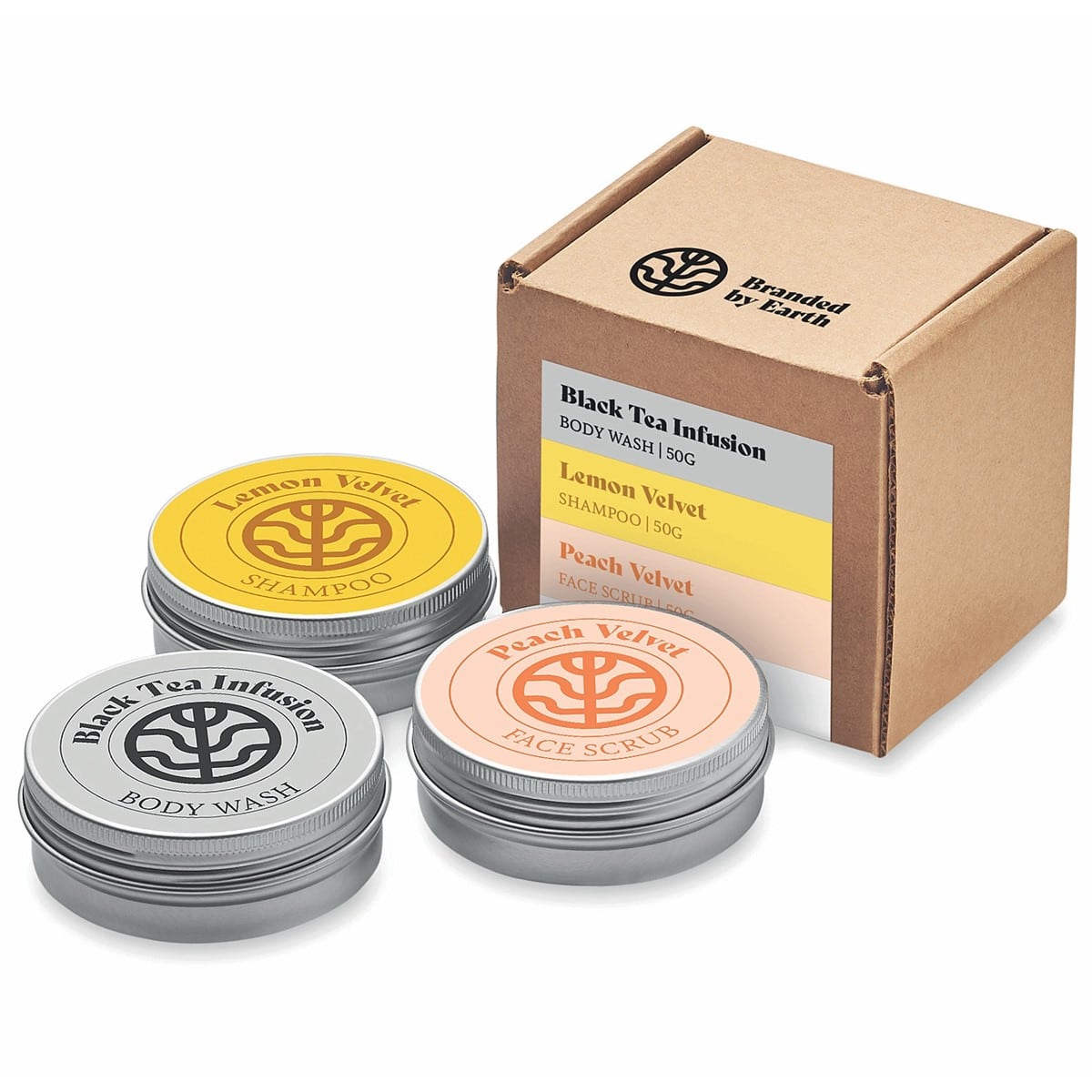 Unisex Travel darilni set znamke Branded By Earth. Vključuje vegansko 50 g milo za telo, šampon in piling za obraz.