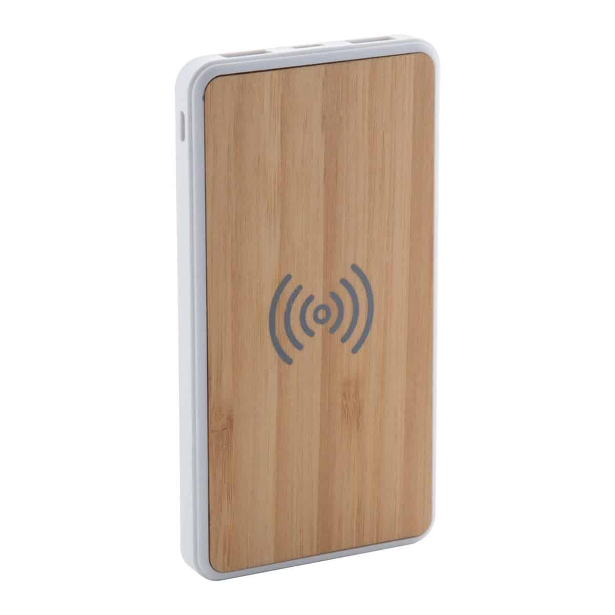 Bamboo USB power bank z 8000 mAh baterijo in vgrajenim brezžičnim polnilnikom. Z 2 USB in 1 priključkoma za polnilnik Type-C. Power Bank je mogoče polniti prek vrat micro USB in Type-C. Vključno s polnilnim kablom USB.