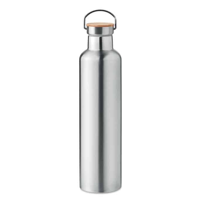Vakuumska flaška z dvojno steno iz nerjavečega jekla z bambusovim pokrovom in ročajem za prenašanje. Kapaciteta: 1 L.